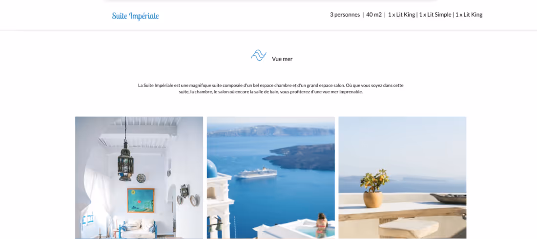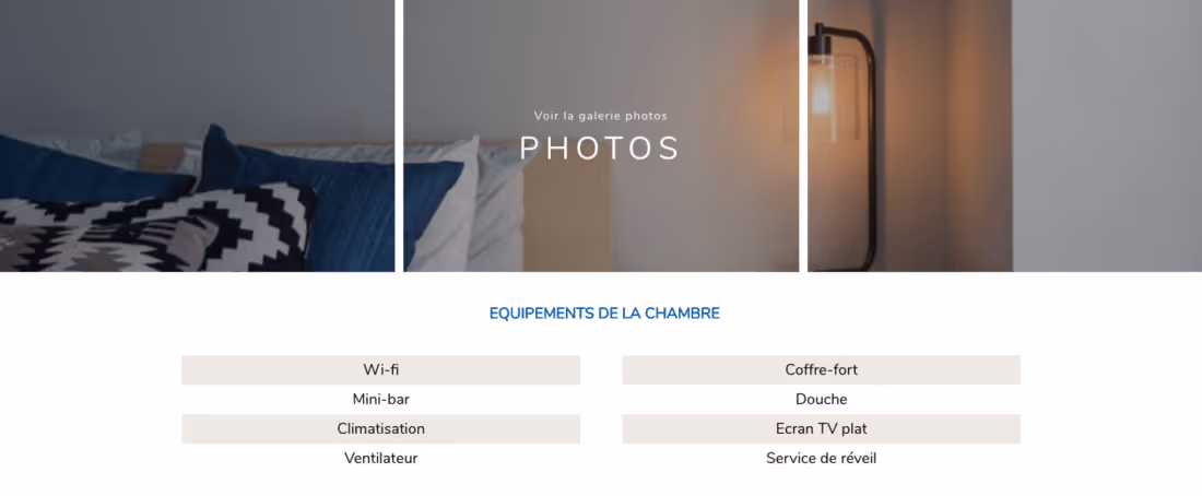 Là encore il s'agit d'une étape clé dans réalisation de votre site internet. La présentation des chambres doit être la fois imagée réaliste et vendeuse. Un voyageur qui cherche une chambre doit en un rapide coup coup, avoir toutes les informations qu'il souhaite : taille de la chambre, salle de bain, équipements, style...
