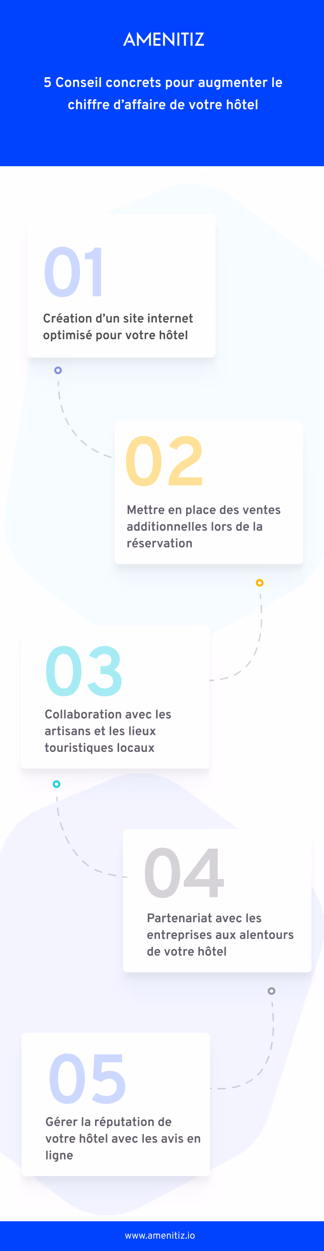 Il existe de nombreux outils et stratégies pour augmenter le chiffre d'affaires de votre hôtel. Avec ces 5 actions concrètes, vous mettez toutes les chances de votre côté pour apercevoir des résultats positifs rapidement. La solution tout-en-un d'Amenitiz peut-être le facteur X qu'il vous manque pour faire la différence. N'hésitez plus et demandez participer une démonstration gratuite auprès de nos adorables experts.