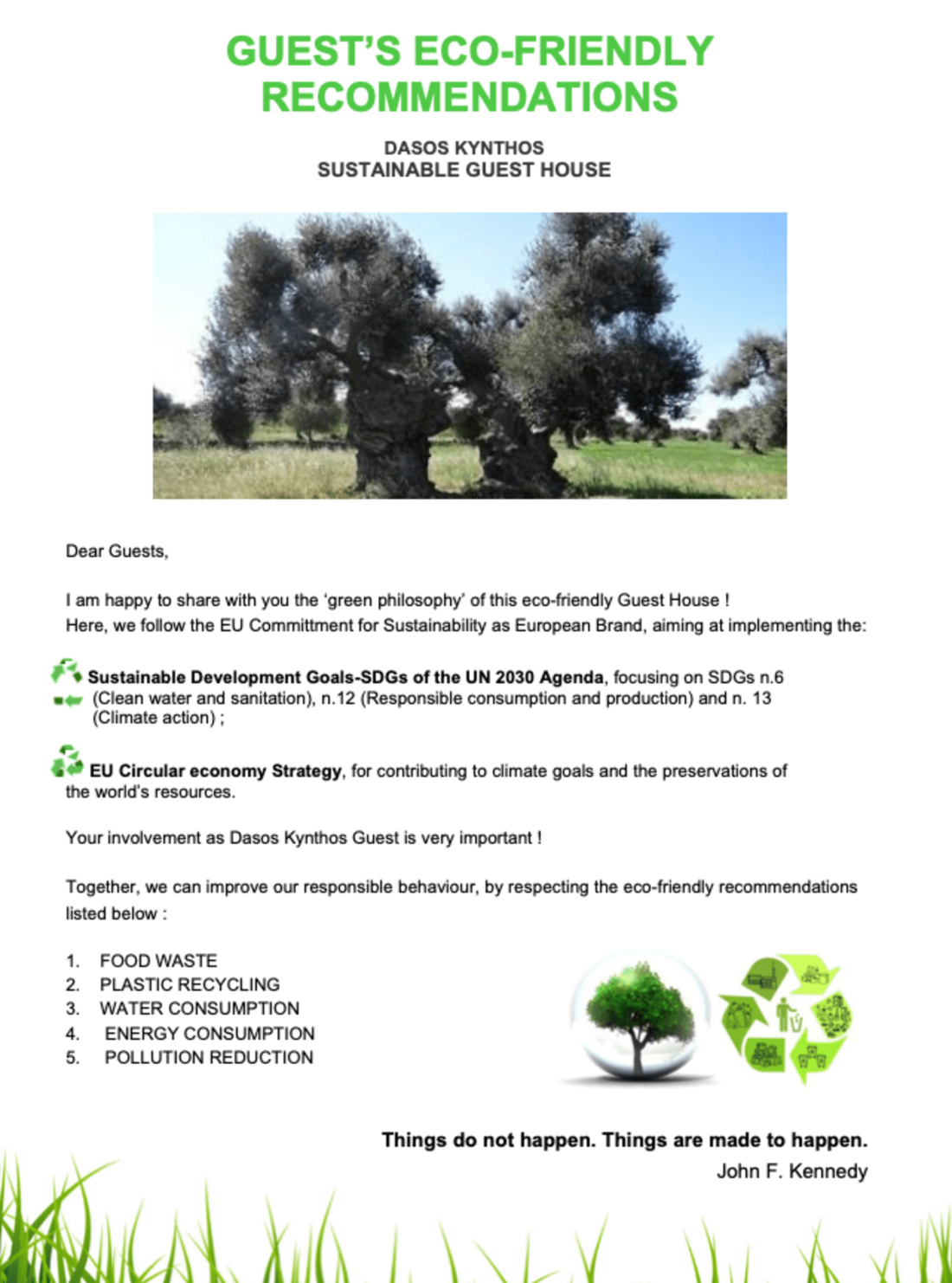 - Mettre des notes pour les clients dans les chambres, pour leur faire part de la démarche de l'établissement et les inciter être plus écologique. Rappel des gestes simples (ex : ne pas laisser la lumière allumée, faire attention de bien fermer les robinets).