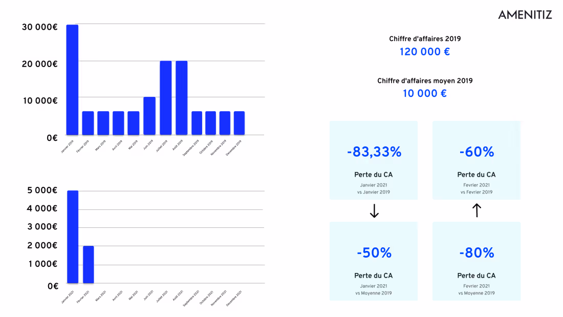Premièrement, vous pouvez prendre votre chiffre d'affaires de l'année 2019 et le diviser par 12 pour avoir la moyenne sur l'année. Comparez cette moyenne avec le mois en question de 2021, janvier par exemple pour voir votre perte.