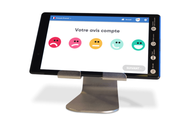 Pour le client voyageur, c'est ultra-simple : Une tablette est mise sa disposition et lui permet dévaluer quelques questions grâce des smileys. Pour valider son avis, le client renseigne son numéro de téléphone ou son adresse email.