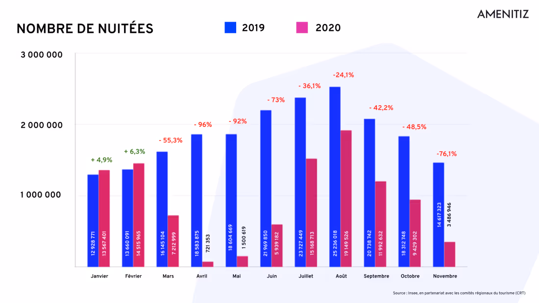 Le rapport de L'Insee sur l'activité touristique en France en 2020 n'a été une surprise pour personne, avec des résultats à la baisse sur quasiment toute l'année en termes de nuitees (seul les mois de janvier et février ont vu des résultats à la hausse). C'est tout le secteur touristique qui a été et qui continue d'être impacté, ce qui demande aux hôteliers de rechercher des alternatives en cette période actuelle. Et le tourisme local fait partie d'une des solutions à ce challenge.