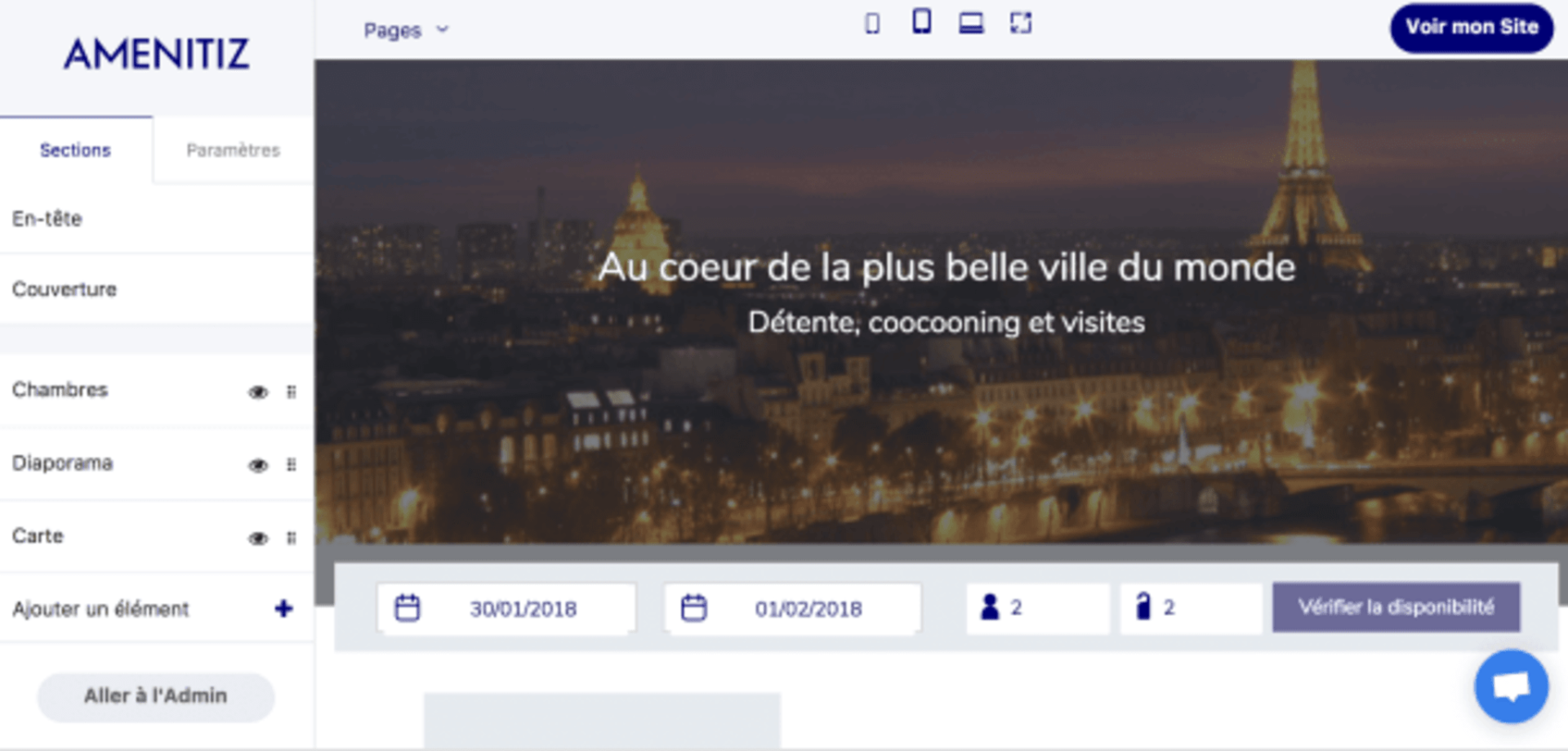 Amenitiz a un logiciel de réservation qui sera complètement intégré votre site internet. Le logiciel de réservation fait partie intégrante de la solution Amenitiz, ce qui signifie qu'à aucun moment le voyageur ne quitte votre site internet au cours de sa réservation.