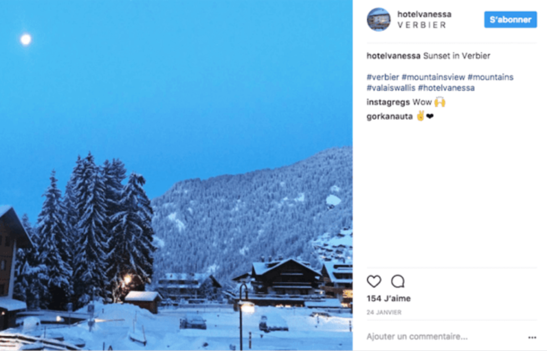 Dans cet exemple, les hashtags sont peu nombreux mais particulièrement efficaces. La localisation est indiqué, suivie du nom de Lieuhôtel et des descriptions de la photo : #moutains #mountainsview .
