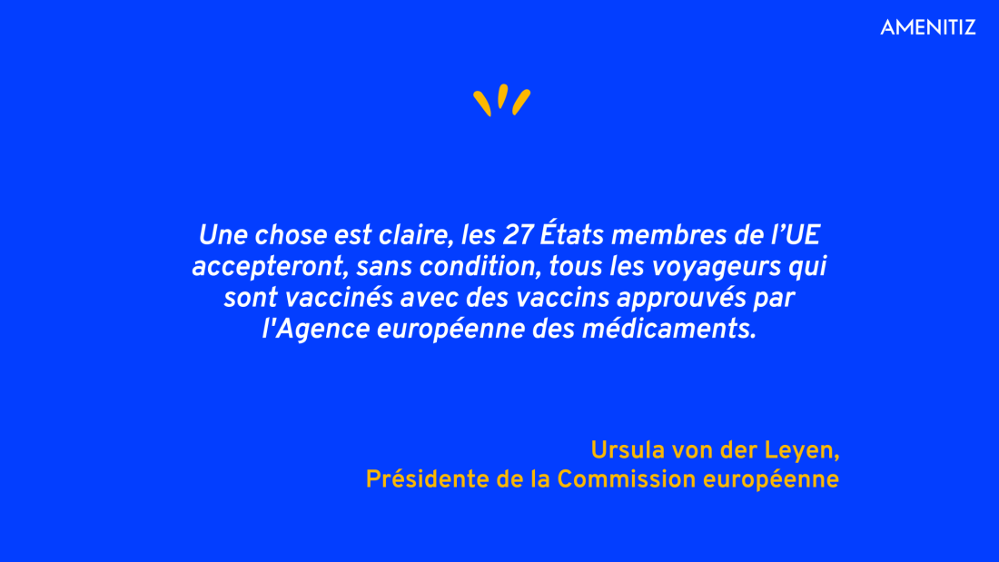 Le message était très limpide de la part d'Ursula von der Leyen : cela permettra la libre circulation et les voyages vers l'Union européenne. Parce qu'une chose est claire, les 27 états membres de L'UE accepteront, sans condition, tous les voyageurs qui sont vaccinés avec des vaccins approuvés par l'Agence européenne des médicaments."