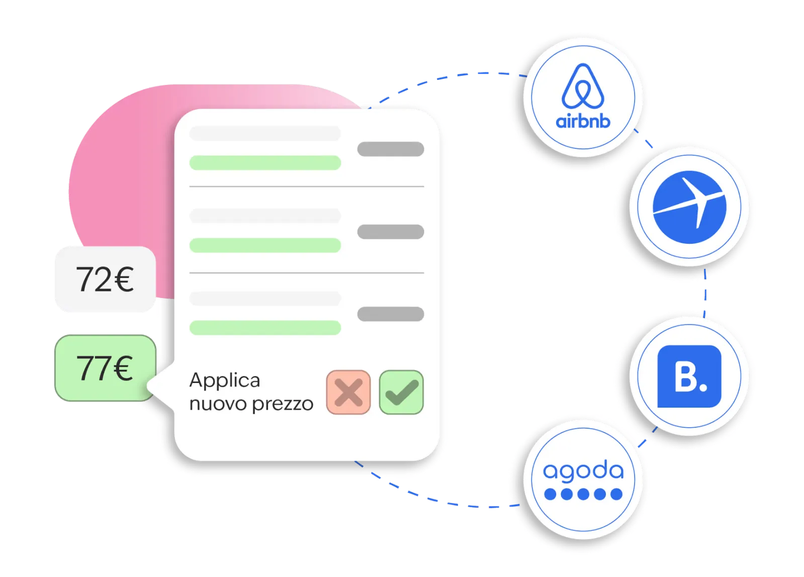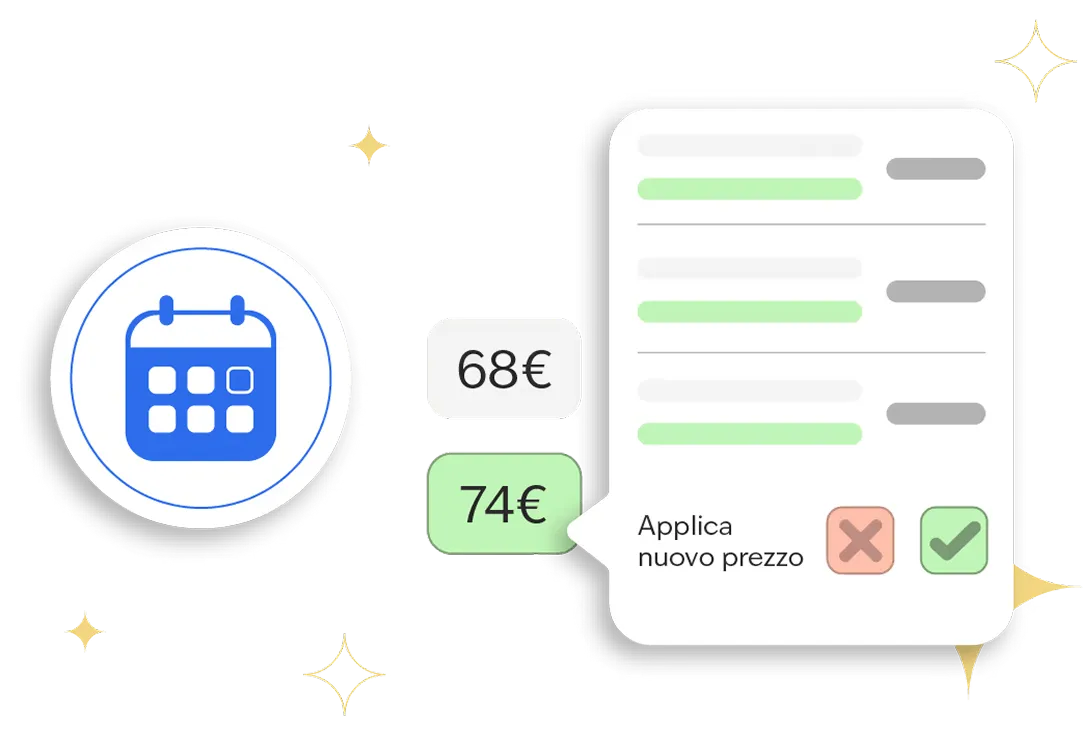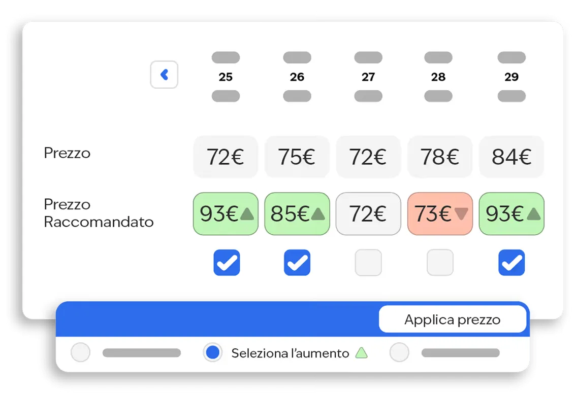 Analizziamo i tuoi dati (occupazione, tempi di consegna e prezzo medio) e i prezzi della concorrenza e li elaboriamo in una raccomandazione di prezzo che puoi accettare con un solo clic per un giorno o tutto in una volta.