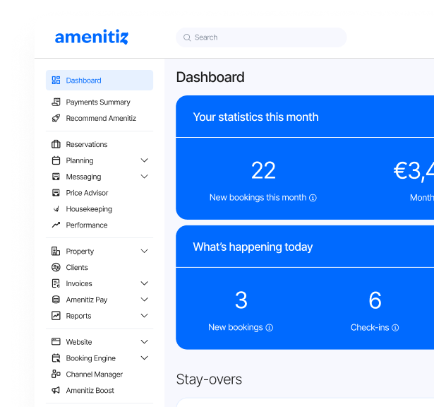 Unlike enterprise channel managers built for large chains and scaled down for smaller properties, Amenitiz was purpose-built for independent hoteliers from day one, with an interface that requires no technical knowledge, an onboarding team that handles the full setup, and multilingual support available in English, French, Spanish, Italian, and Portuguese.